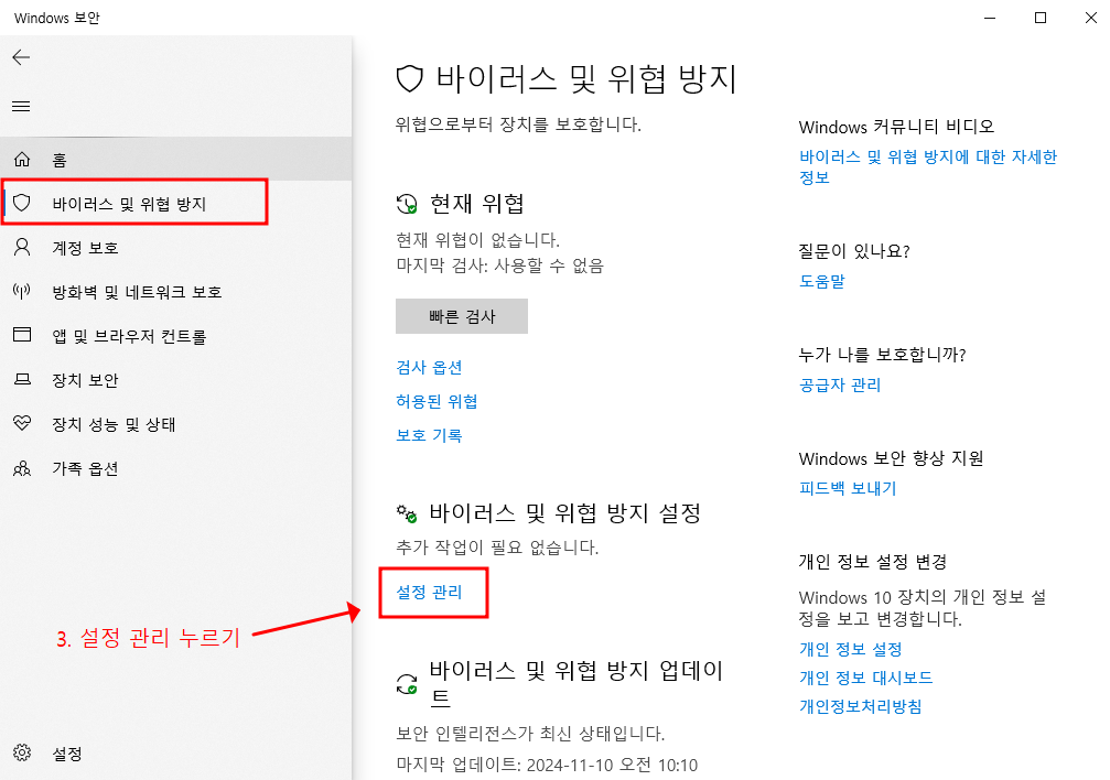 2. 바이러스 및 위협 방지 설정으로 이동하여 [설정 관리]를 클릭합니다.